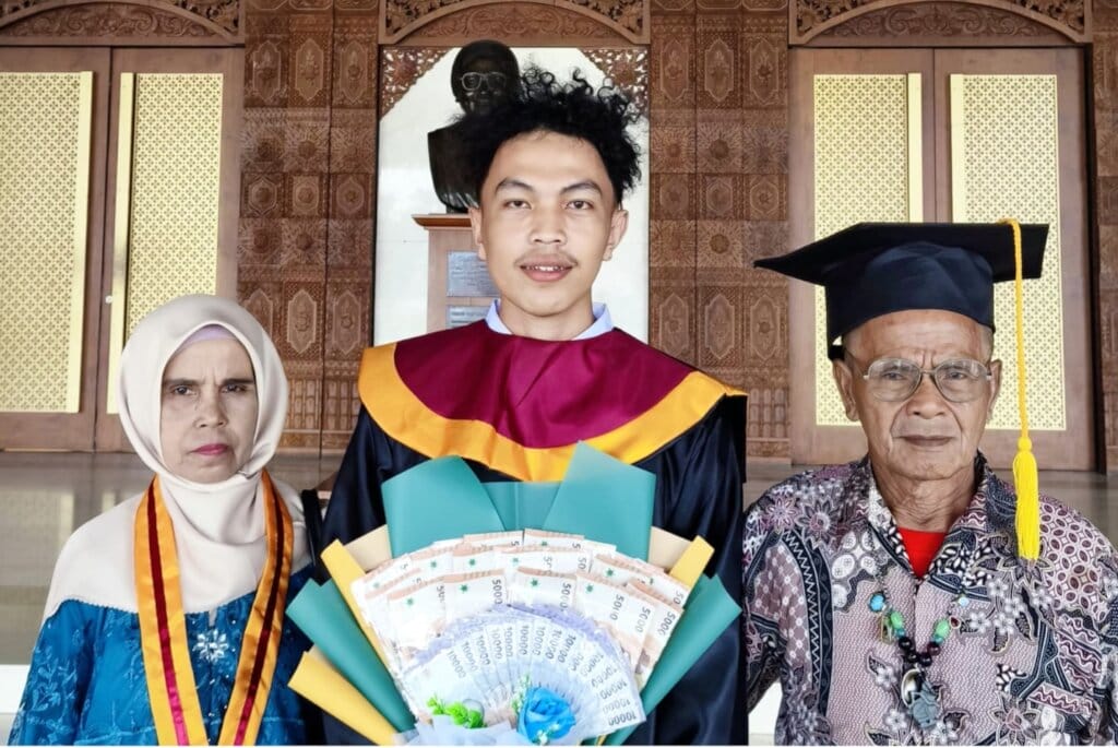 Arto Widodo wearing his graduation gown, accompanied by his parents at the graduation ceremony at the Ahmad Dahlan Institute of Technology and Business in Jakarta.