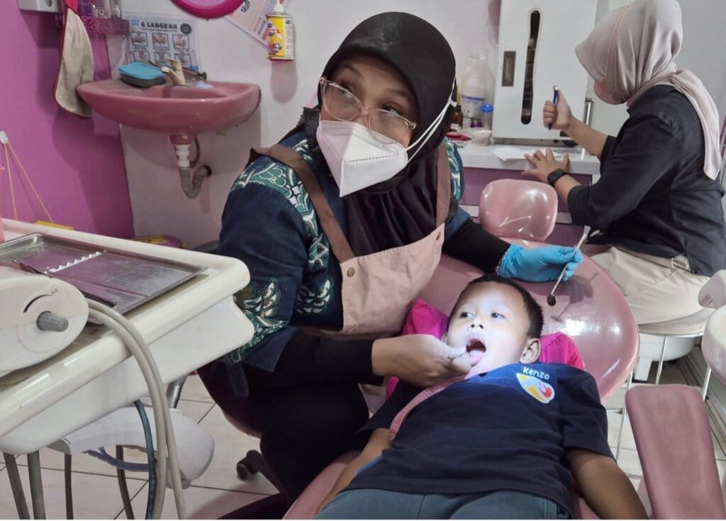 A dentist is examining the dental health of one of the children under XSProject’s care.