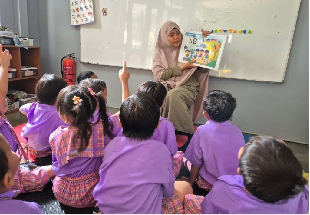 Fani is teaching children in the XSProject Learning House kindergarten class.